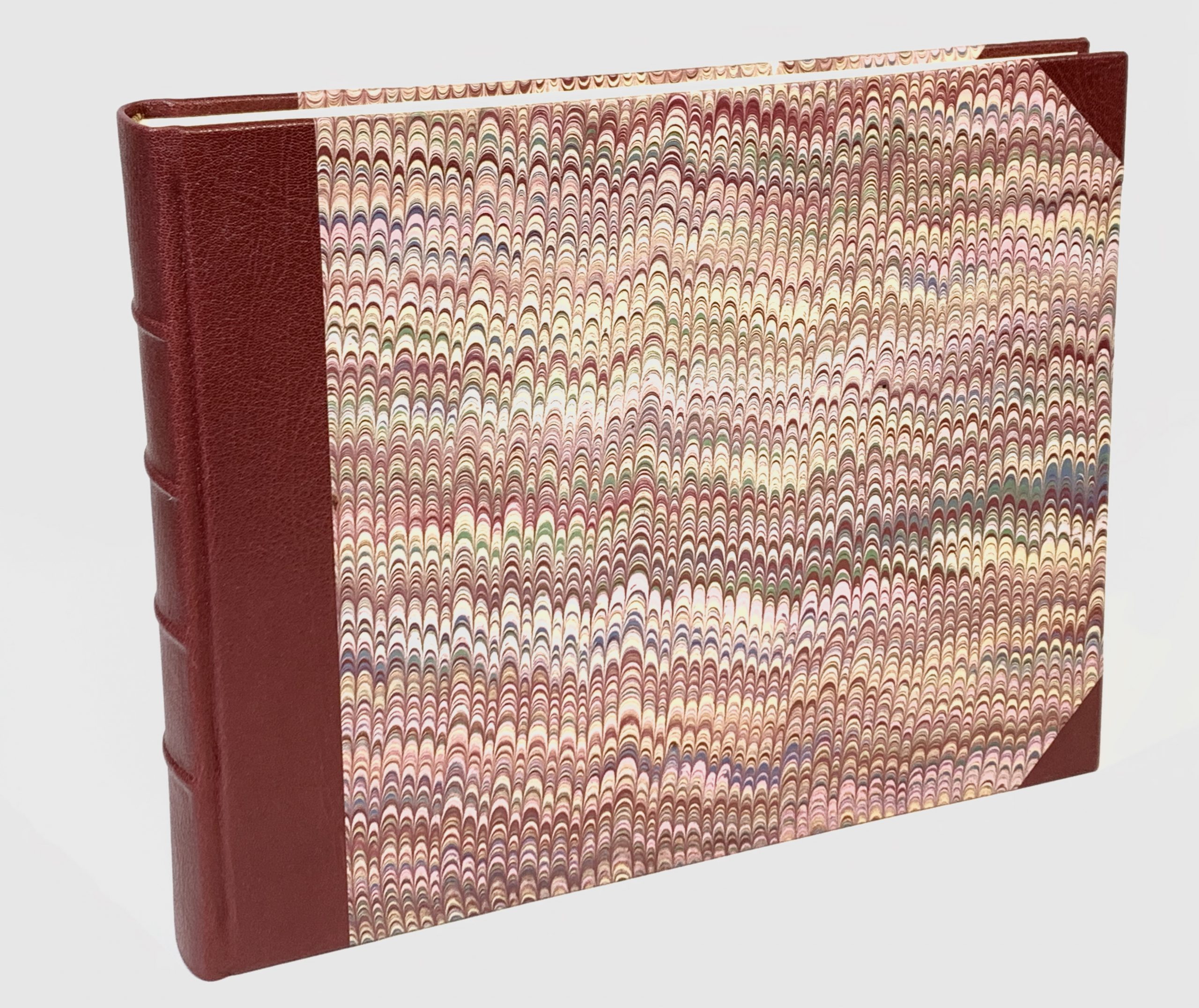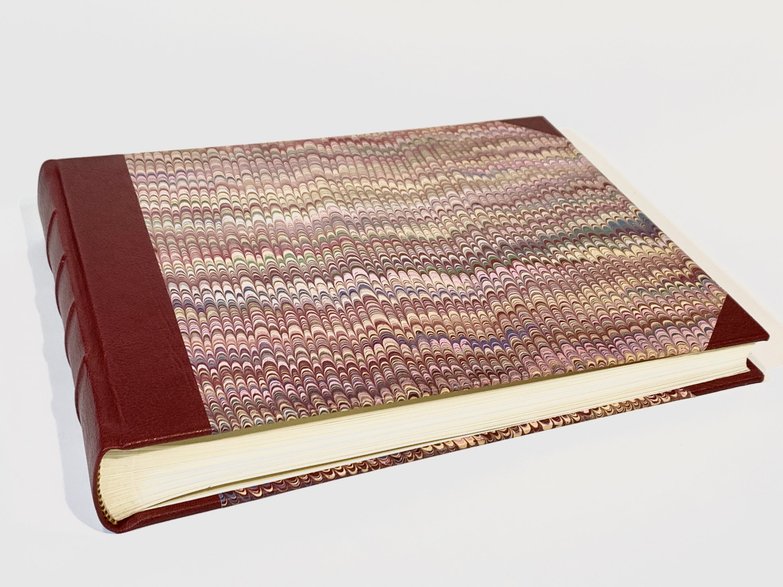 Álbum de fotos encuadernado con piel y papel pintado a mano (marmoleado).