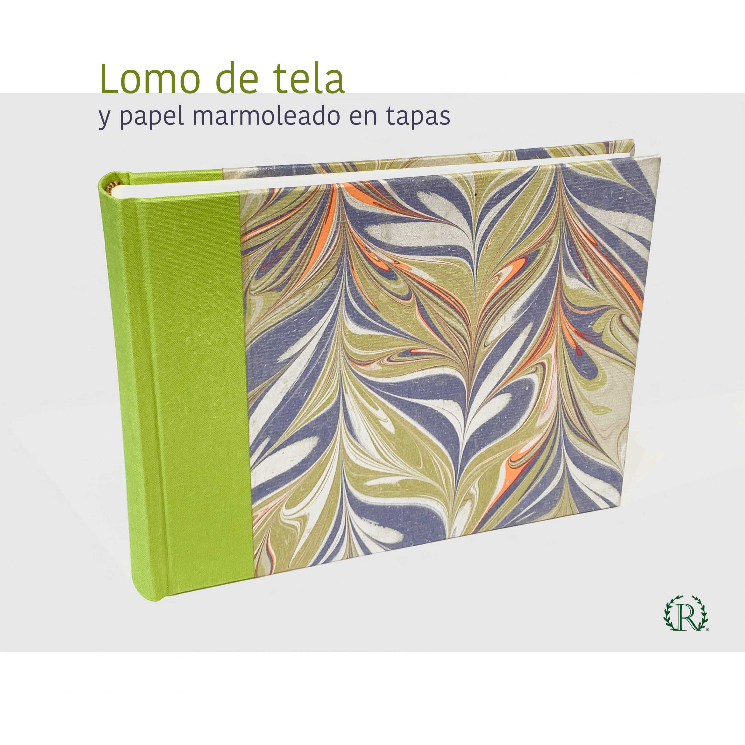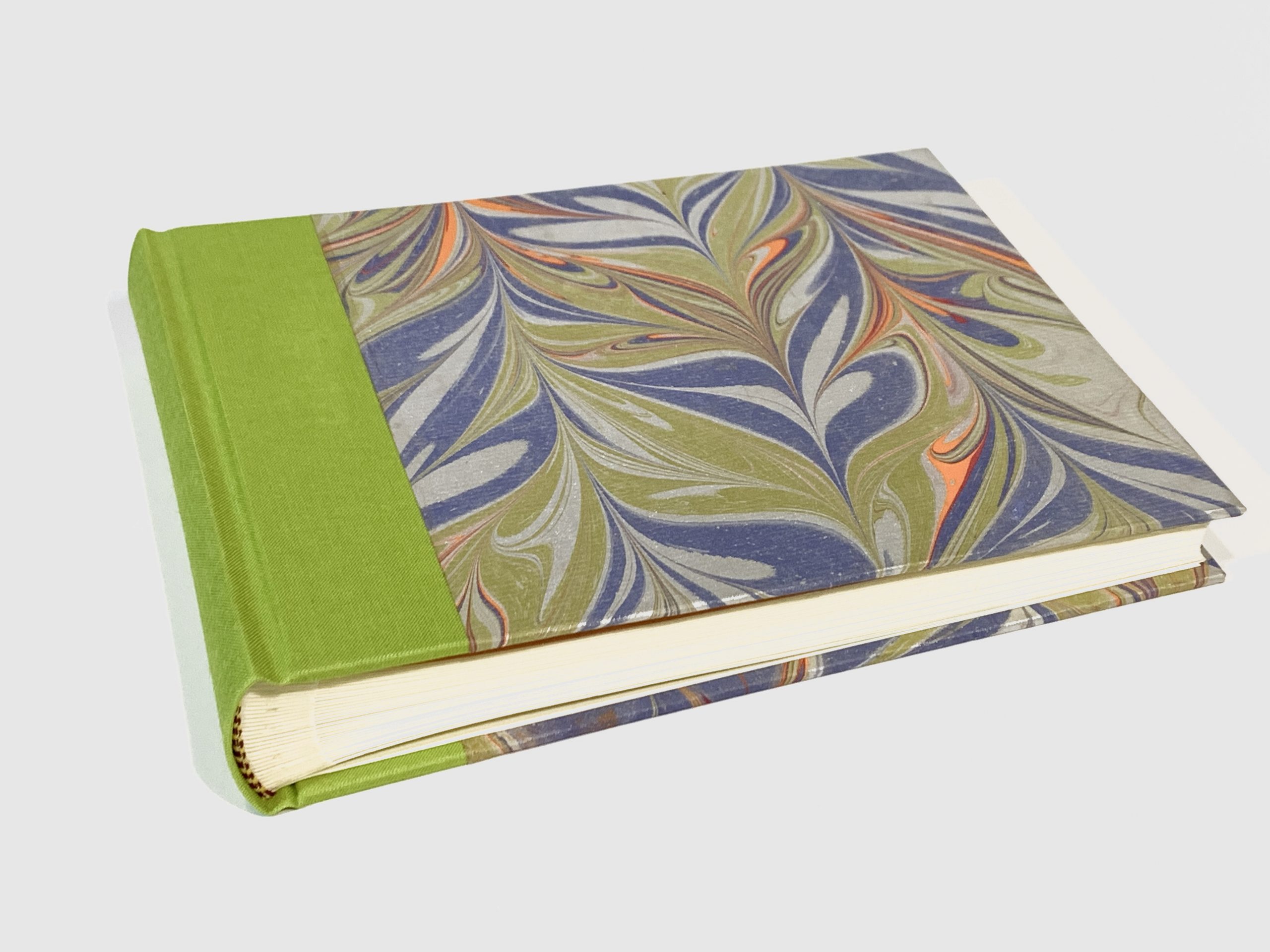 Tela color verde lima en lomo y papel marmoleado hecho a mano sobre tapas.