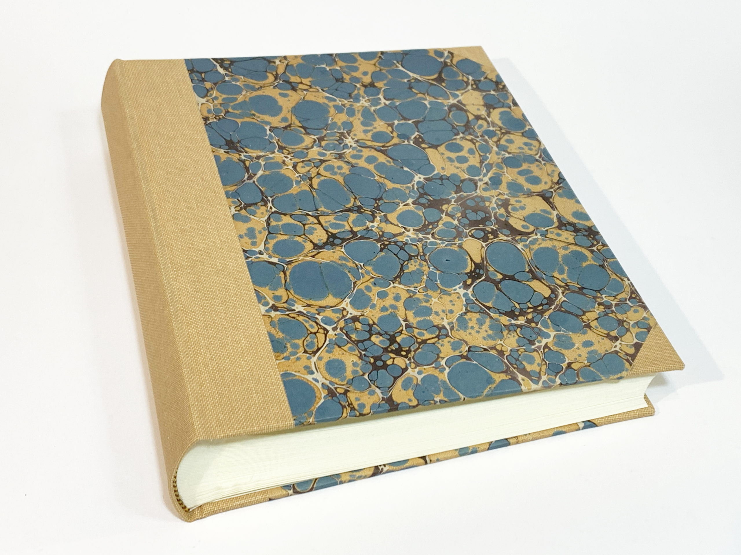 Álbum de fotos encuadernado con tela y papel pintado a mano (marmoleado).