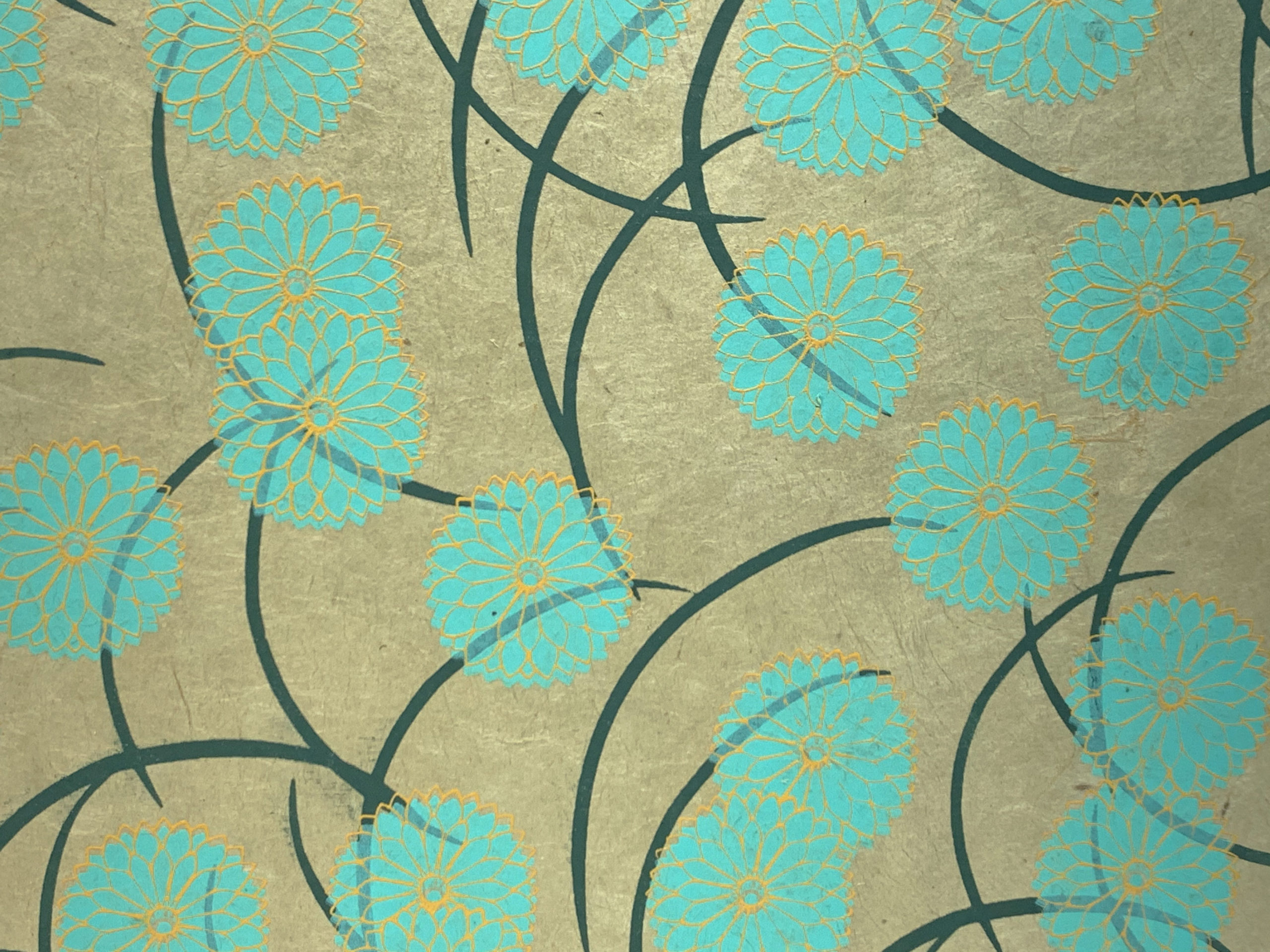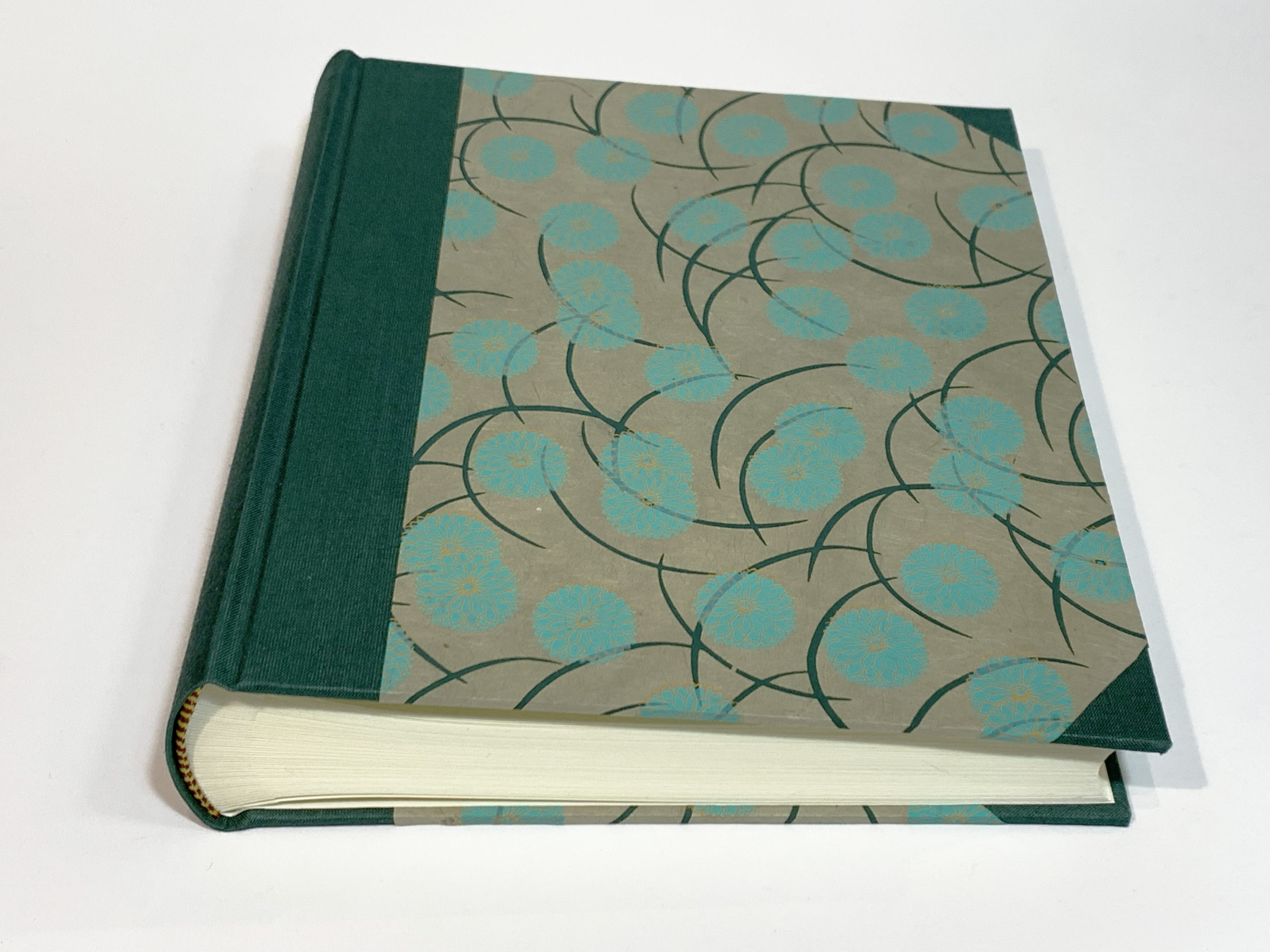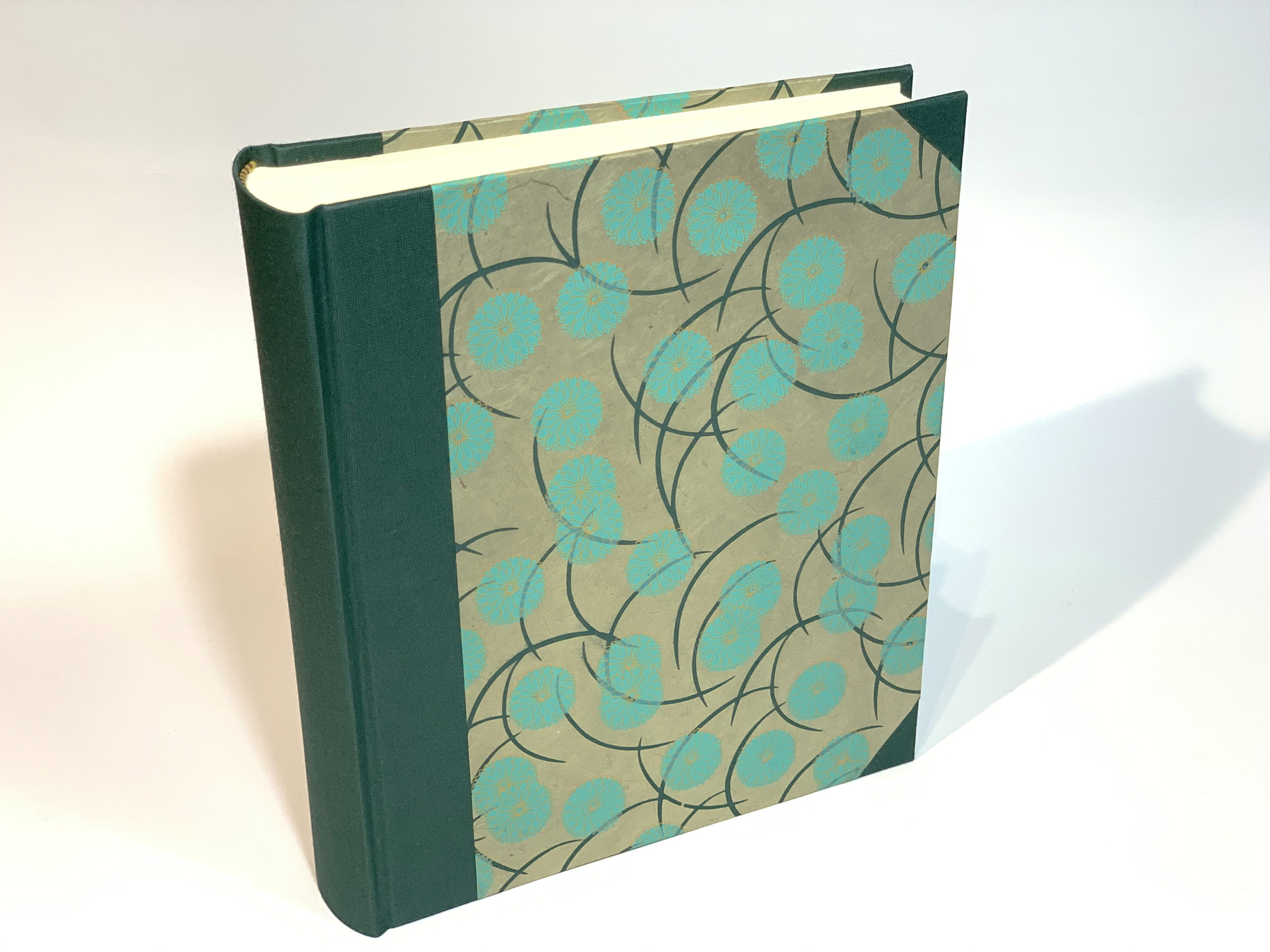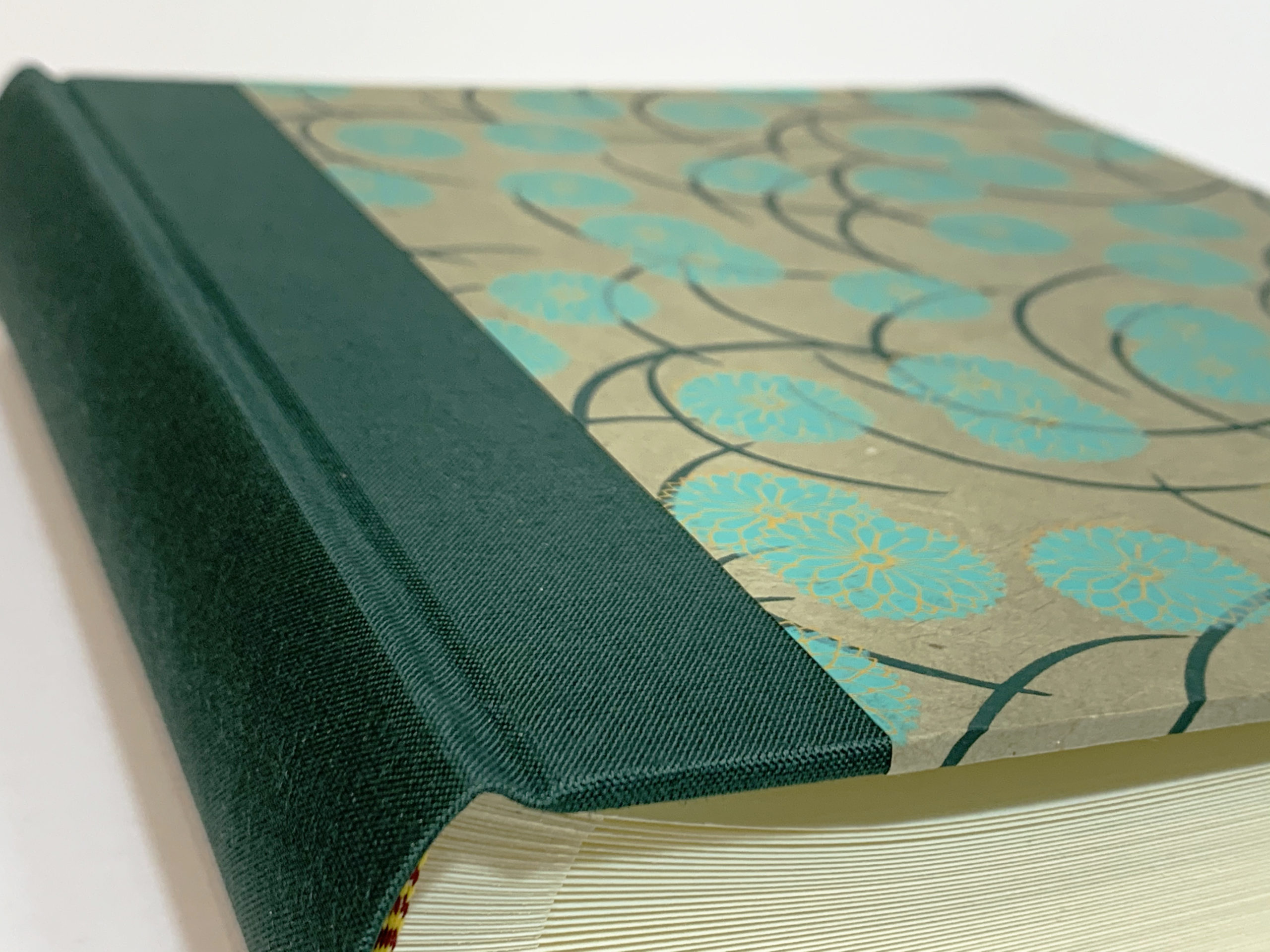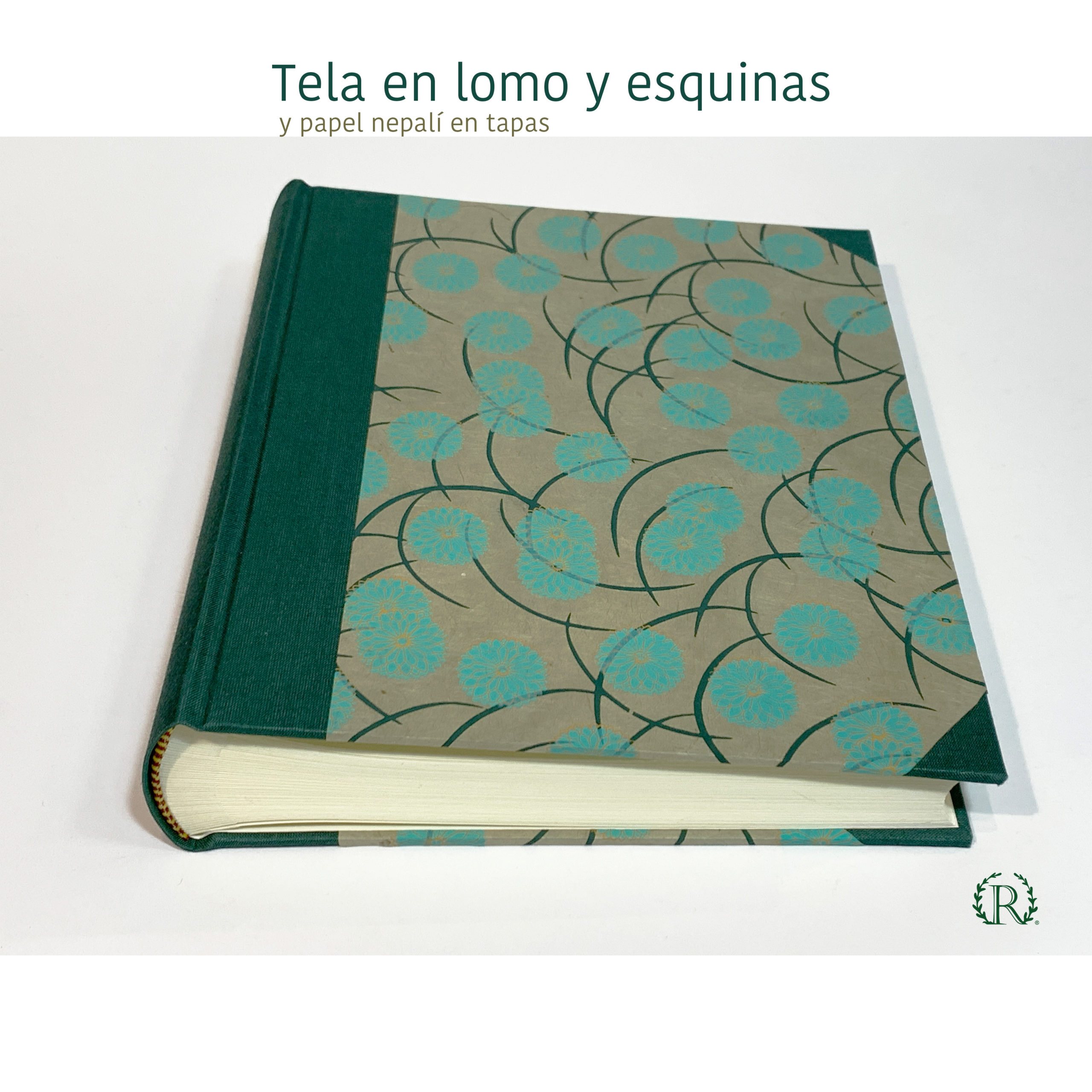 Tela color verde en lomo y esquinas, y papel de Nepal hecho a mano sobre tapas.