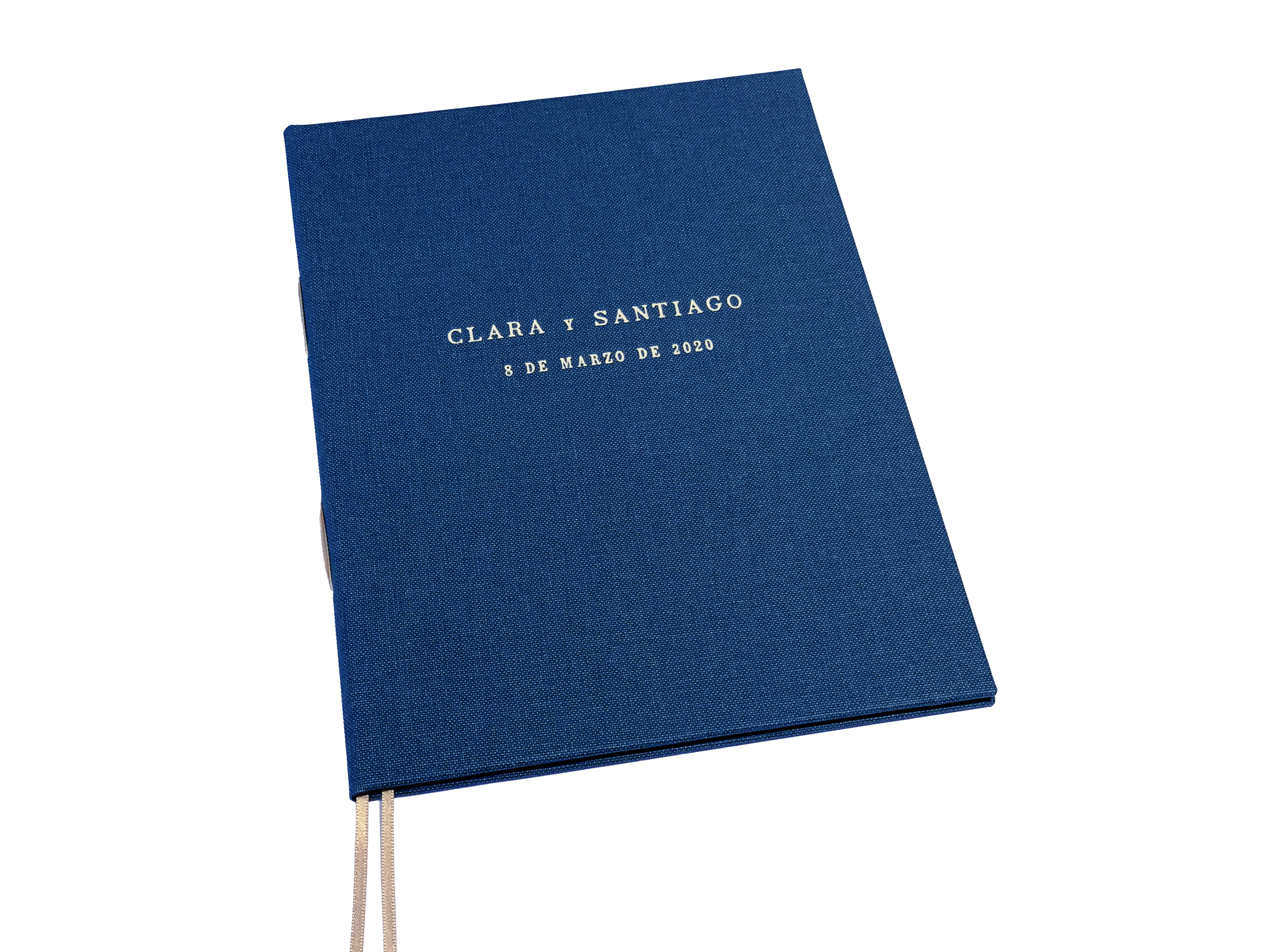 Este trabajo incluye la realización de las tapas en tela, la estampación de la portada en autentico relieve con los nombres de los novios y fecha, y 12 hojas de 160grs. verjuradas color marfil.