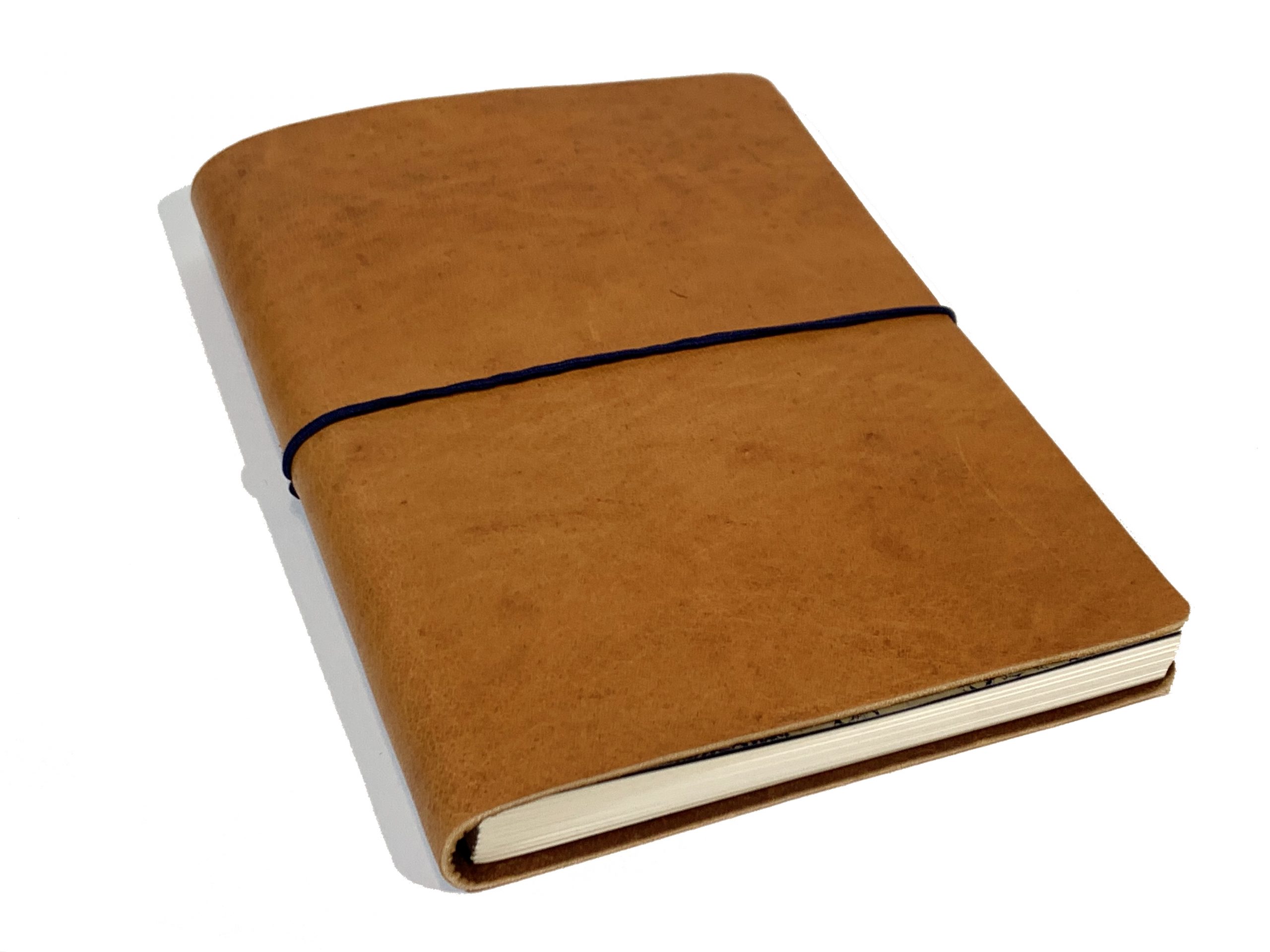 Cuaderno de tapa flexible en piel de ciervo y cierre con goma.