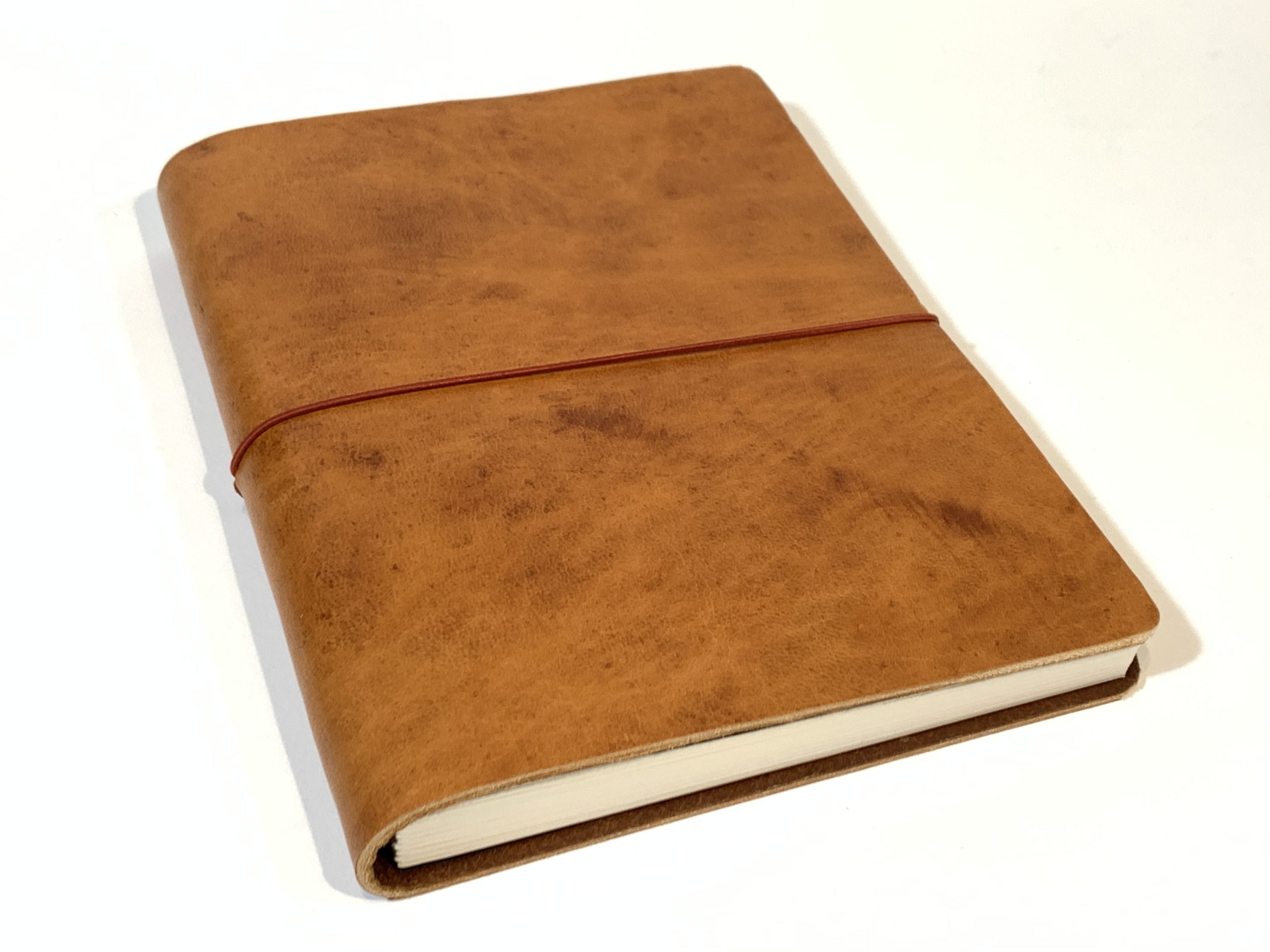 Cuaderno de tapa flexible en piel de ciervo y cierre con goma.