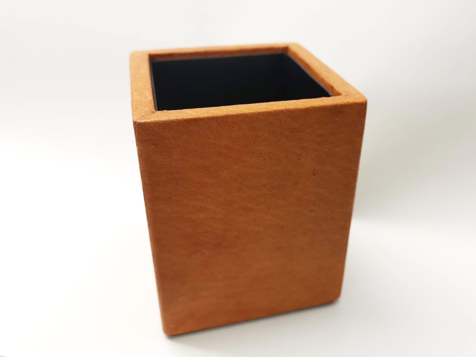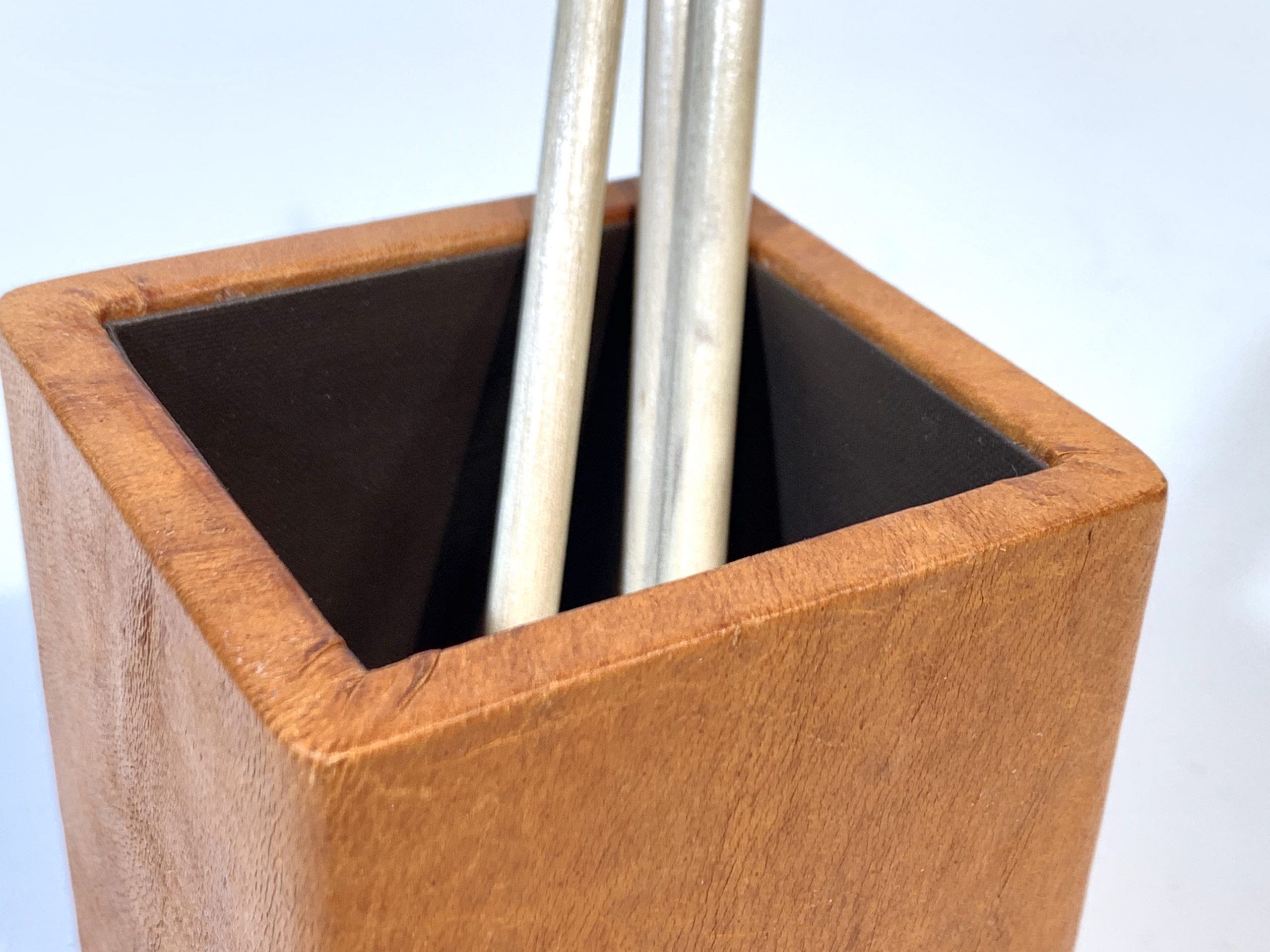 Cubilete con estructura de madera y forrado en piel de ciervo color natural.