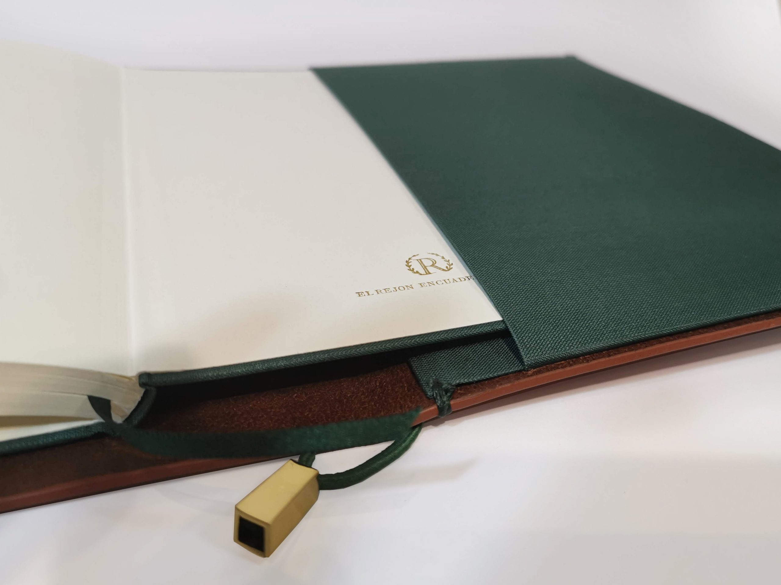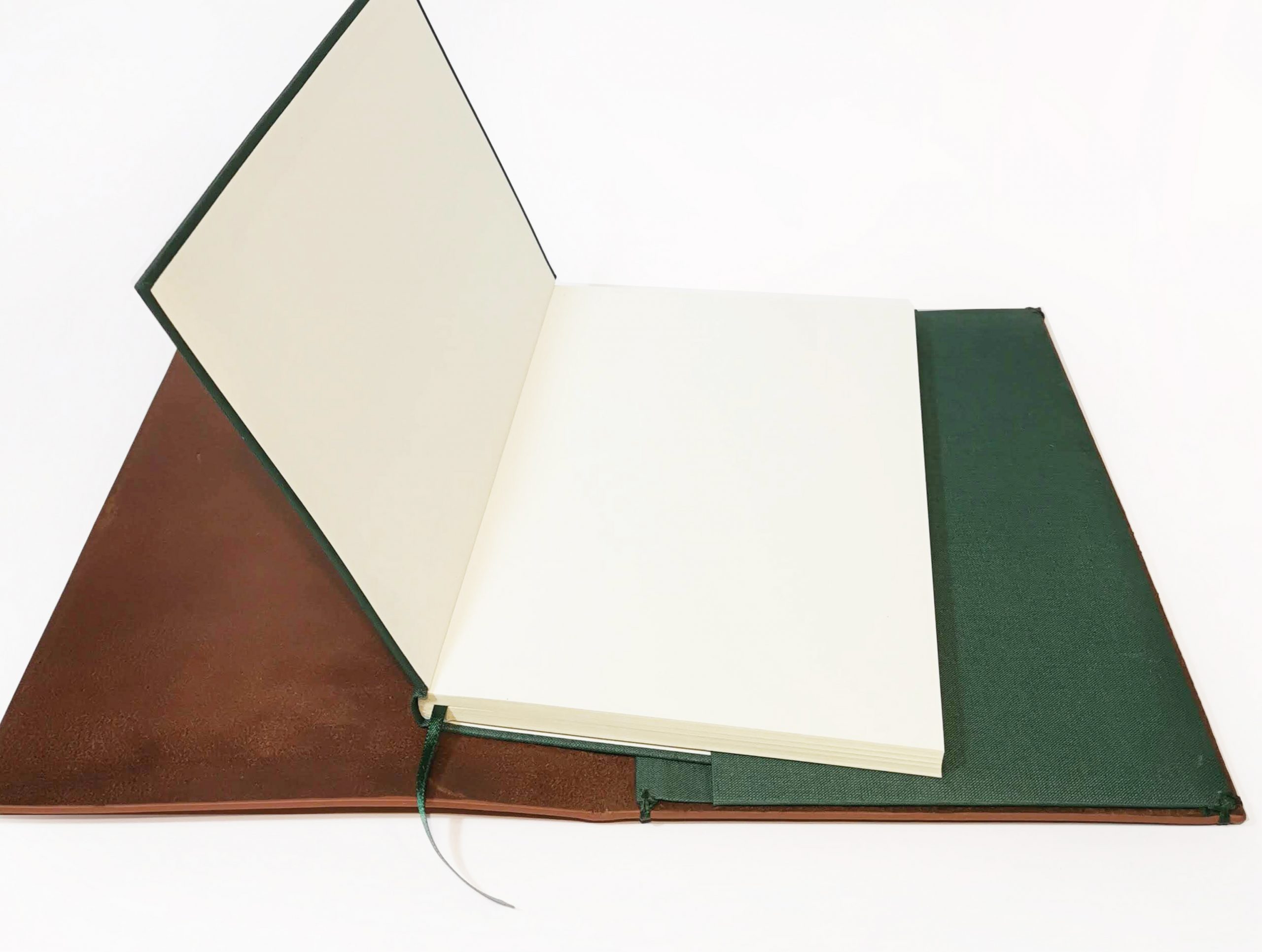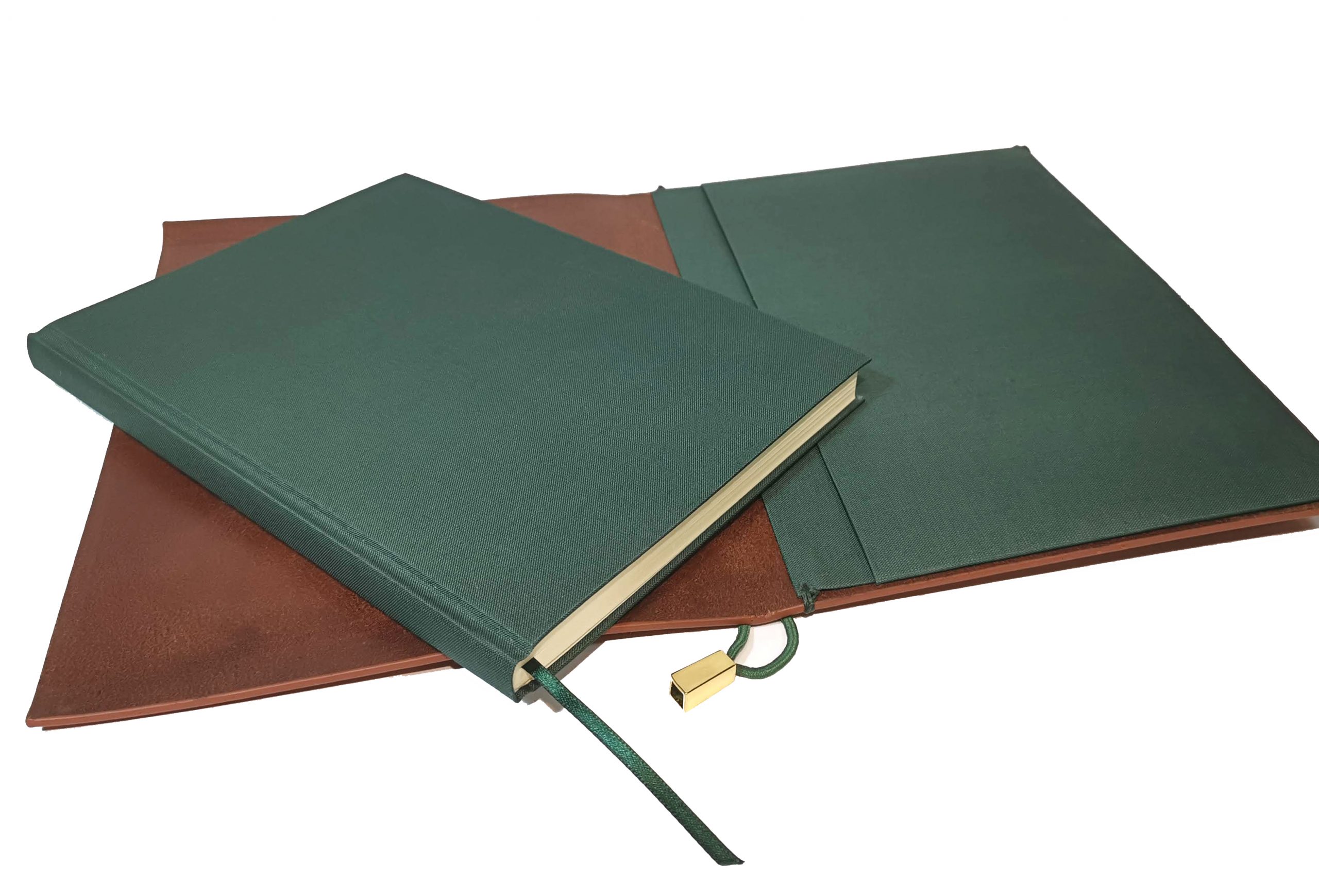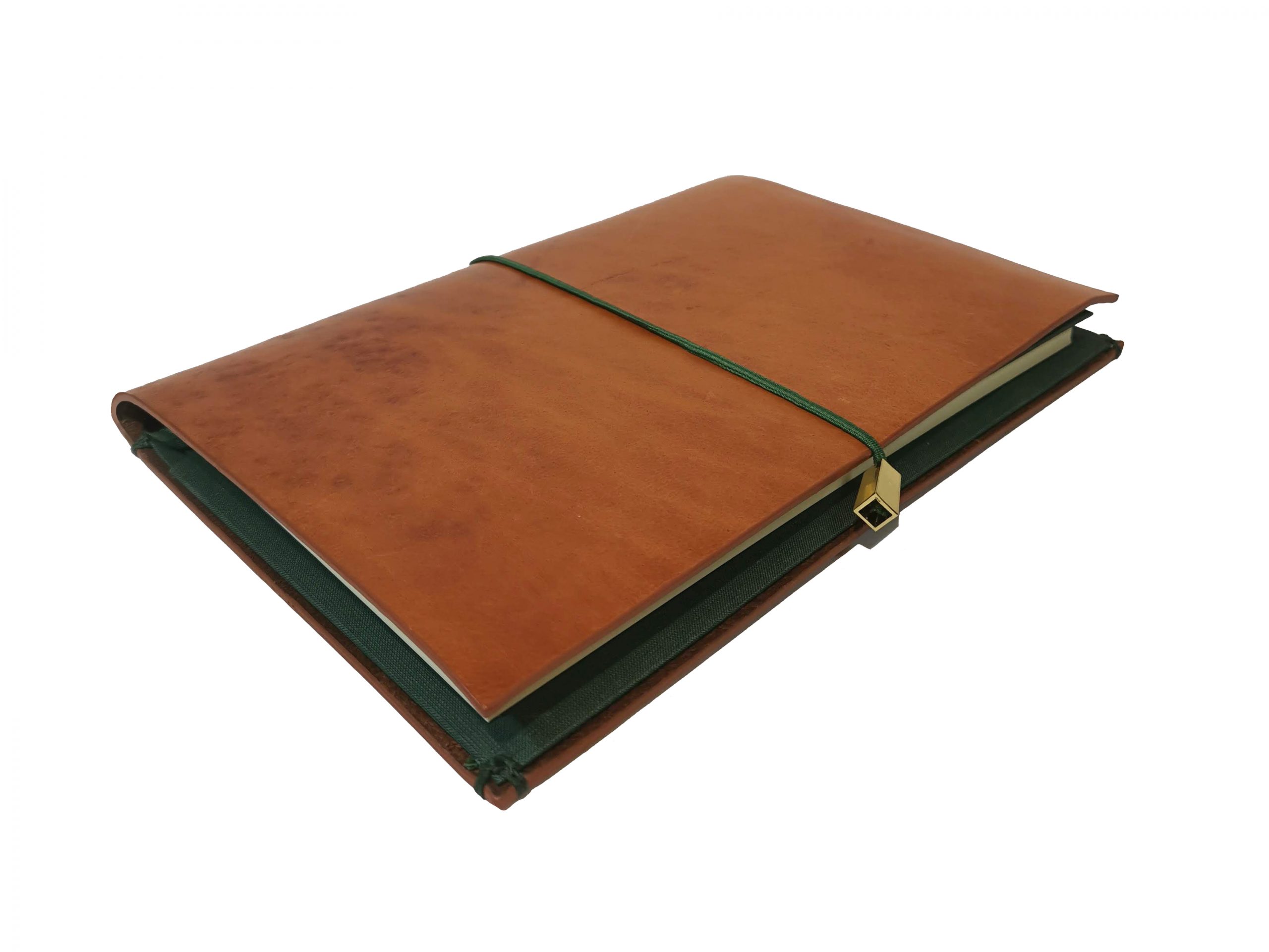 Funda de piel de ciervo color natural con bolsillo de tela. Incluye un cuaderno de tapas rígidas encuadernado en tela color verde.